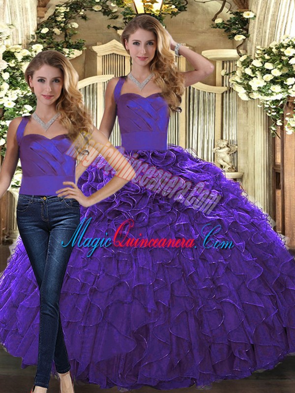 Wonderful Purple Organza Lace Up Halter Top Sleeveless Floor Length 15 Quinceanera Dress Ruffles