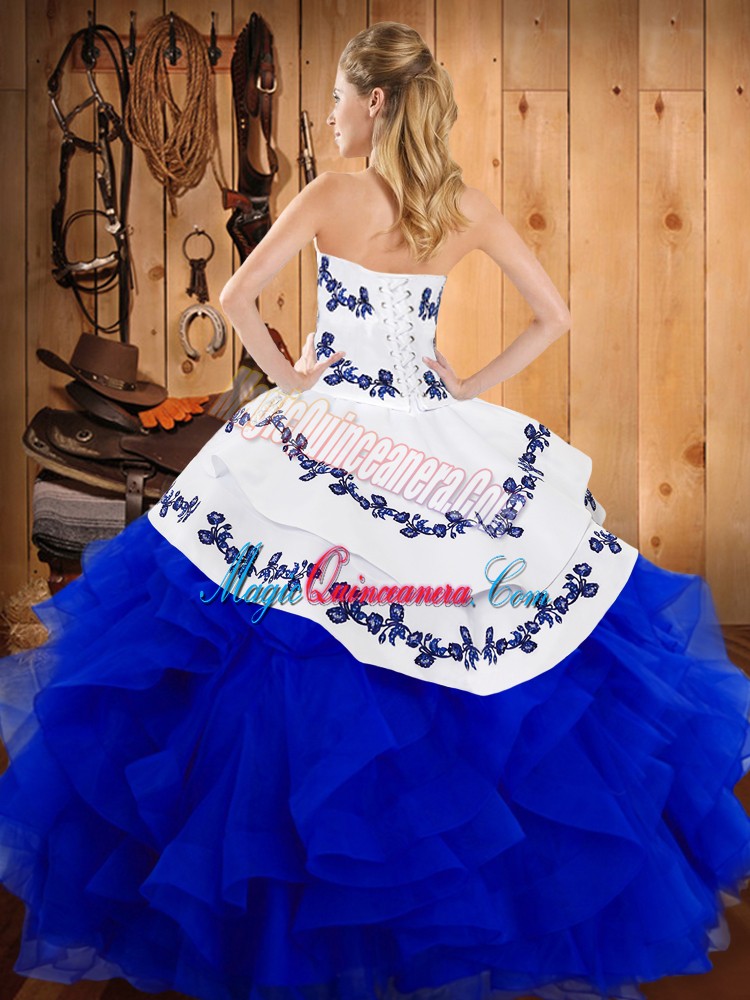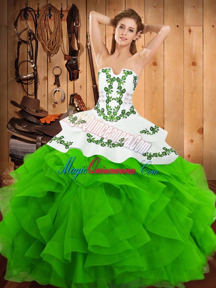 Wonderful Sleeveless Satin and Organza Floor Length Lace Up Quince Ball Gowns in Green with Embroidery and Ruffles