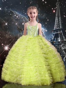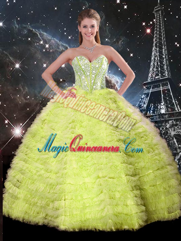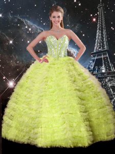 Yellow Green Ball Gowns Beading and Ruffles 15th Birthday Dress Lace Up Tulle Sleeveless Floor Length