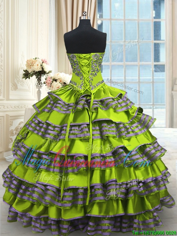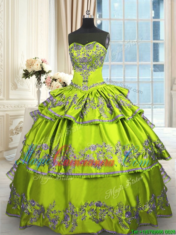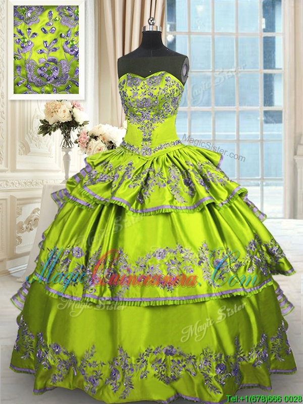 Yellow Green Ball Gowns Embroidery and Ruffled Layers 15th Birthday Dress Lace Up Taffeta Sleeveless Floor Length