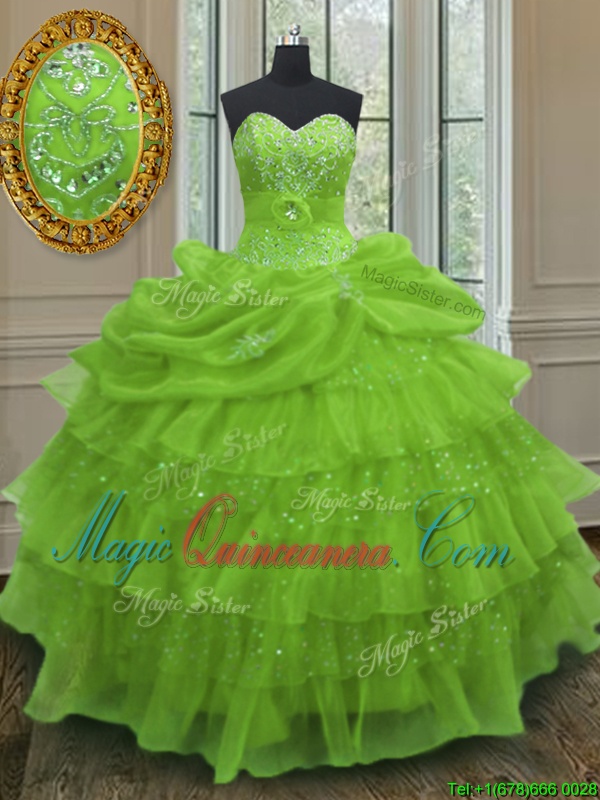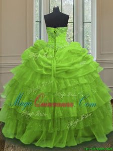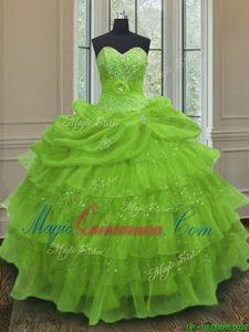 Yellow Green Ball Gowns Sweetheart Sleeveless Organza Floor Length Lace Up Beading and Ruffled Layers and Pick Ups Quince Ball Gowns