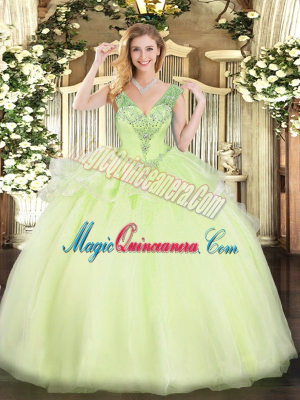 Yellow Green Ball Gowns V-neck Sleeveless Tulle Floor Length Lace Up Beading Sweet 16 Quinceanera Dress