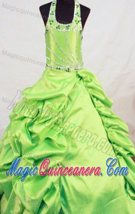 Yellow Green Beaded Halter Kid Pageant Gowns With Pick-ups