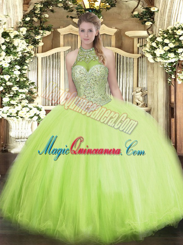 Yellow Green Lace Up Halter Top Beading Quinceanera Dresses Tulle Sleeveless