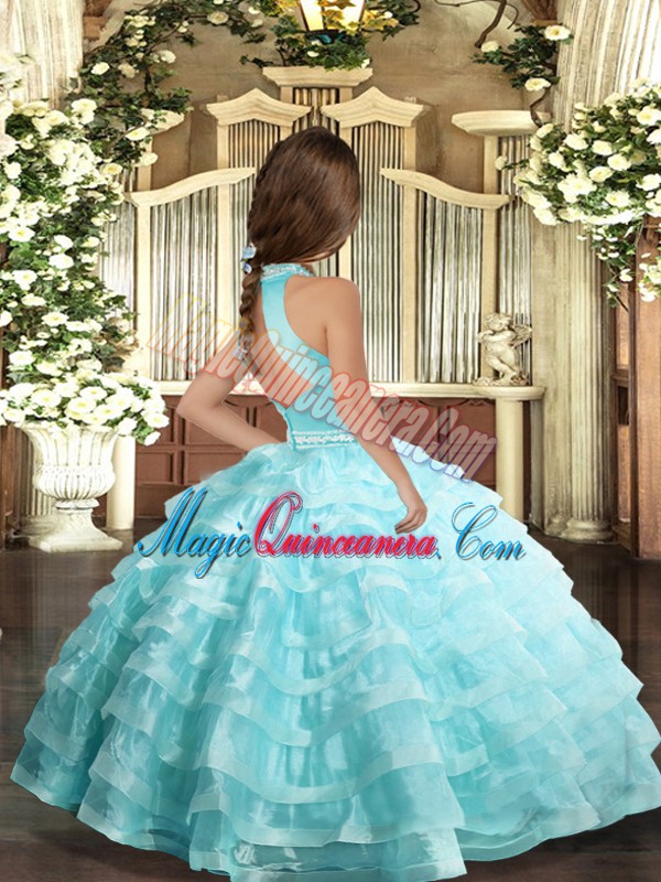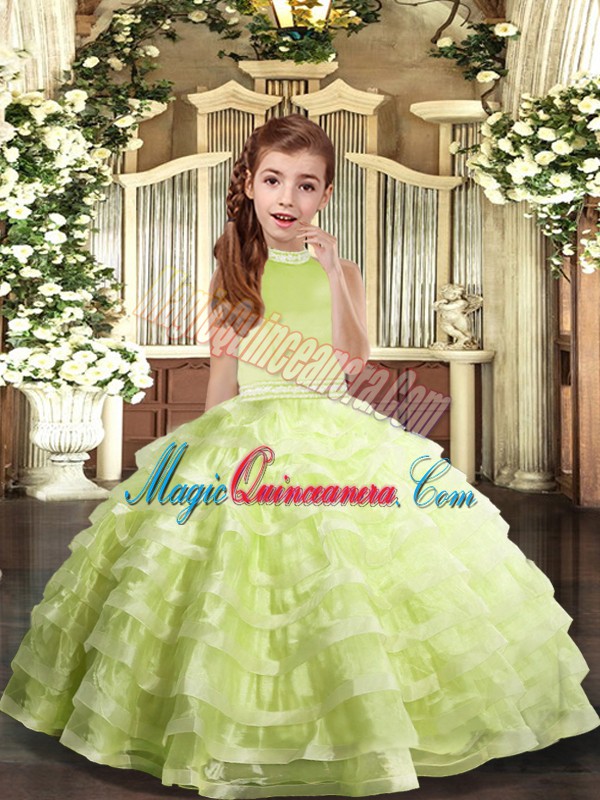 Yellow Green Sleeveless Floor Length Beading and Ruffled Layers Backless High School Pageant Dress